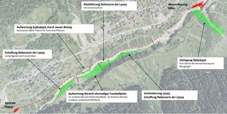 Die Lonza wird entlang der unterirdischen Druckleitung zwischen Wiler und Kippel noch attraktiver und lädt zum Verweilen ein. Umfangreiche Begleitmassnahmen ergänzen deshalb den Bau des Kraftwerks. Beispielsweise verbreitern wir das Flussbett, bauen ein grosses Biotop und schaffen mit einer flachen Uferböschung Platz für gemütliche Stunden. Zudem werden als Hochwasserschutz rechtsufrig die bestehenden Ufer verstärkt und an den gefährdeten Stellen erhöht. Alle Massnahmen sind in der Karte unten ersichtlich.