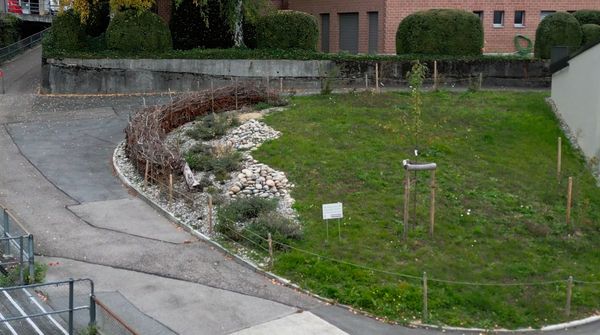 In Zusammenarbeit mit den Auszubildenden der Gartenbauschule Hünibach wurde die Umgebung naturnah und lebensraumfördernd gestaltet. Die neue Anlage entwickelt sich zu einem vielfältigen Naturraum, in dem verschiedene Pflanzen, Insekten (z.B. Wildbienen), Eidechsen, Vögel und viele andere Kleintiere neuen Lebensraum finden.